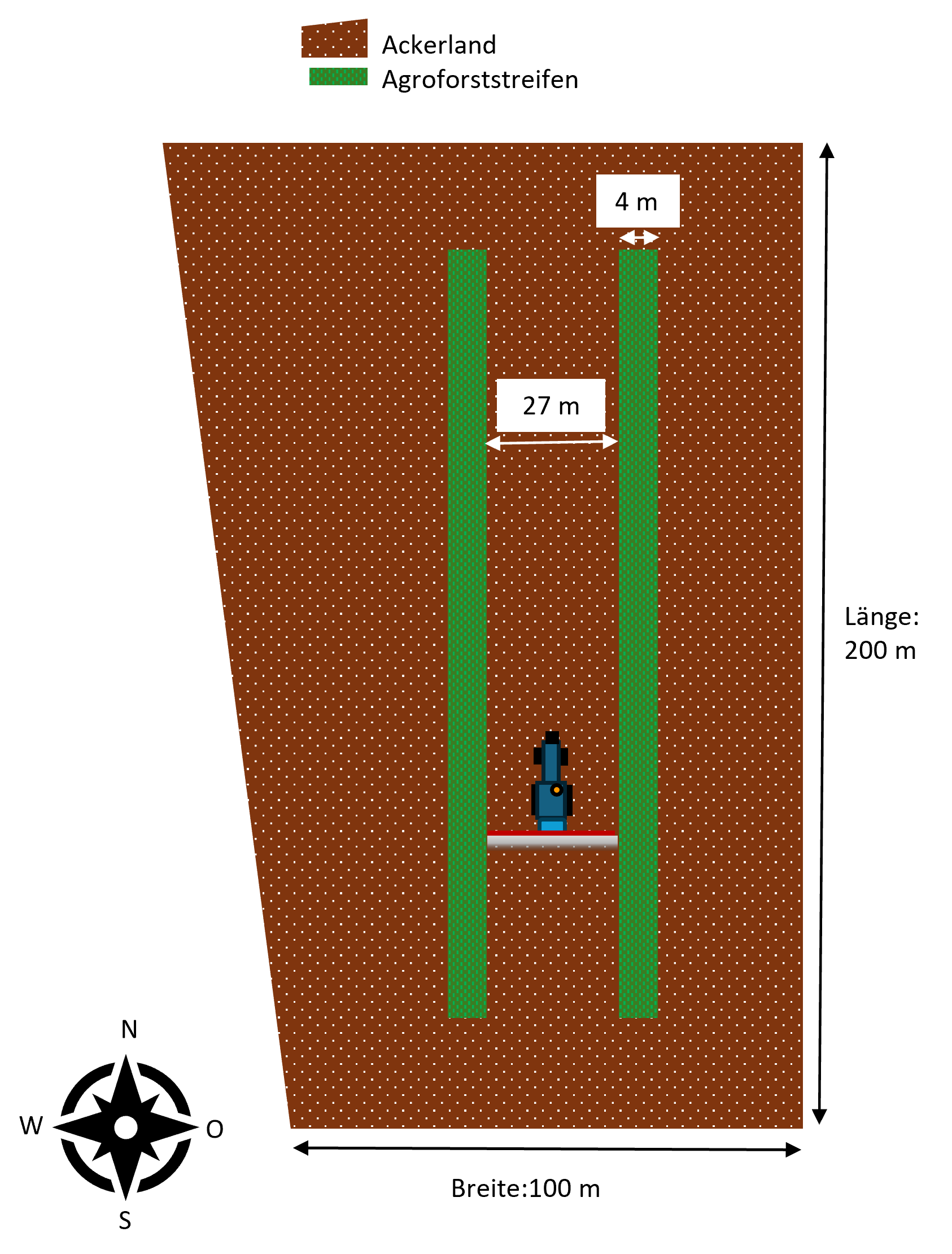 Auf dem in Abbildung 1 dargestellten Feldschlag werden zwei Agroforststreifen von je vier Metern Breite im Abstand von 27 Metern zueinander vorgesehen. Erstgenannte Breite ergibt sich aus den Vorgaben der AUKM 554, gemäß der mindestens zwei Meter Bewirtschaftungsabstand an beiden Seiten von Agroforstanpflanzungen einzuhalten sind. Der Abstand zwischen den Agroforststreifen wird den betrieblichen Bedürfnissen angepasst; insbesondere der Maschine mit der größten Arbeitsbreite. Hierbei handelt es sich üblicherweise um die Pflanzenschutzspritze. Es wurden nur Flächen mit Agroforstsystemen überplant, bei denen es arbeitswirtschaftlich sinnvoll möglich ist. So wurden beispielsweise sehr schmale Flächen und solche, bei denen die Regularien der AUKM 554 nicht eingehalten werden können, nicht mit Agroforststreifen überplant.